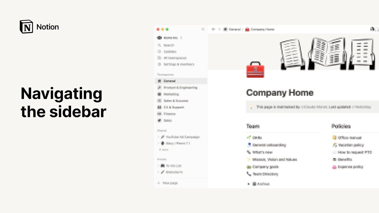Everything you do in Notion takes place in a workspace. It's your virtual home to organize information and create exactly the way you want — as just one person, together as a team, or across a whole company. Expand, edit, and mold it to fit your needs 🏠