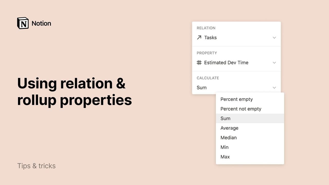 View and aggregate information about properties from relation properties. Useful for summarizing interconnected data. Learn more here →